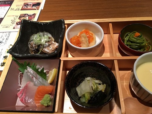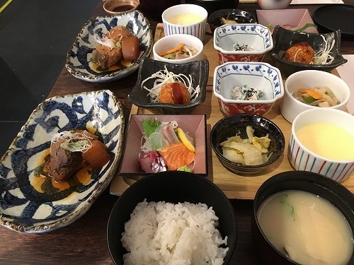 刺身、ブリ大根、コロッケ、白和え、野菜の煮物、茶碗蒸し、ご飯、漬物、味噌汁がセットになっています。