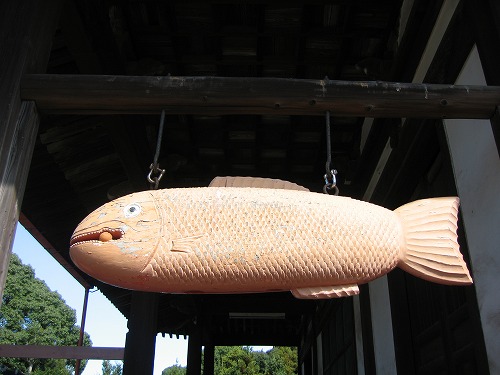 この魚の形をしたものは、開ばんと呼ばれるものです。開ばんを叩いて儀式や行事を知らせます。