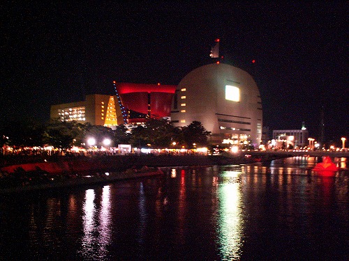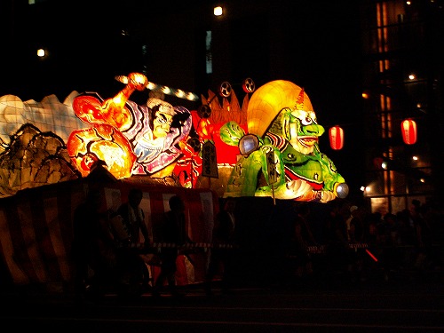 こちらの魚の形をした山車は、八幡東区の新しいお祭りです。八幡東区は「製鉄の町『火の町』」ということで、「火」を連想させる祭り「ネブタ」を、地区に潤いと子供達に夢をということで、2000年に始められたそうです。笛、太鼓のお囃子の音色にのって、「ラッセラー♪ラッセラー♪」の掛け声を元気よく出しながら跳人が楽しそうに踊っていました。本場青森の「ねぷた」と比較すると山車の大きさも迫力も1/10以下だと思いますが、可愛らしいプチネブタです。これから年々盛り上がっていくことを期待しています。