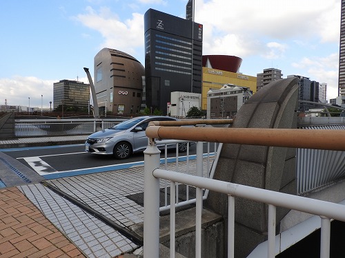 火の橋(室町大橋)は、明治時代末期頃まで紫川で行われていた鵜飼いの漁火をモチーフとして、橋の両サイドにガス灯を配しています。このガス灯は、週末の夜になると火が点ります。火の橋の欄干の波の模様は、見る角度や歩く速さによって、その表情が微妙に変化します。