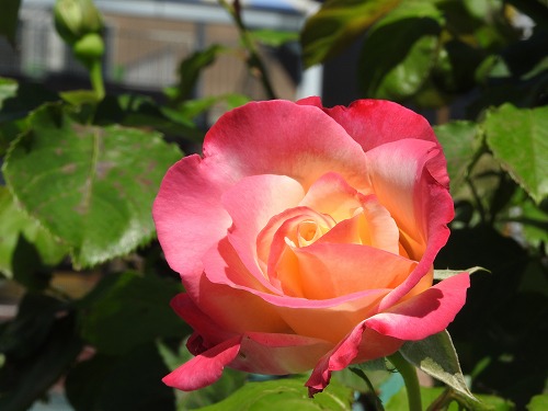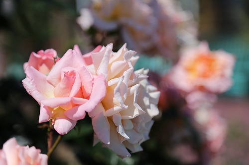 井筒屋小倉店本館9階屋上にローズ・ガーデンがあります。色とりどりのバラが咲き、甘い香りが漂っていました。町中のデパートの屋上に咲いたバラの甘い香りに誘われて、ミツバチも来ていました。
