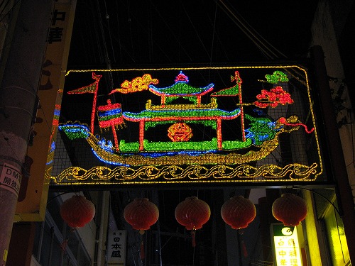 中華街にアーチ型の「中国イルミネーション」があります。イルミネーションは、中華街の十字路の上にアーチを架け、竜や天女など中国の伝統的な図柄を5色の電球をちりばめて描いたものもです。最大のものは、幅4.3m、高さ1.8mもあります。