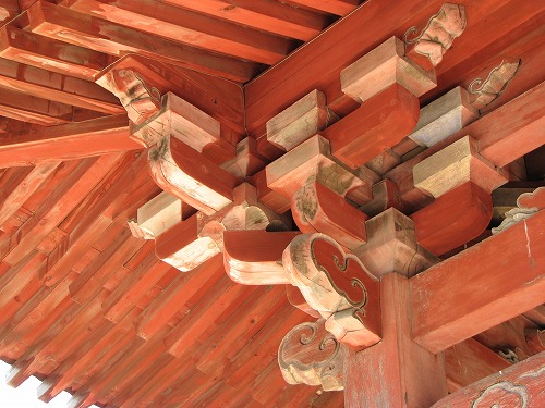 現存するこの山門は、元禄3年(1690年)に再建されたものです。構造は三間三戸八脚門の入母屋造で、単層屋根・総朱塗の雄大な山門です。