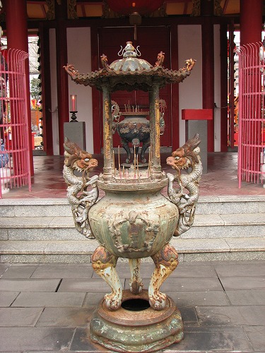 長崎孔子廟の正門となる門を儀門(ぎもん)といいます。昭和初期の台風によって破壊されましたが、1967年(昭和42年)に再建したもので、本廟の正式な内正門(二の門)です。元来中国の廟の門戸は三ヶ所以上の奇数をもって作られており、中央は神さまと皇帝以外の通行を禁じていて、平常は閉ざされている神聖な門です。(長崎孔子廟HPより)