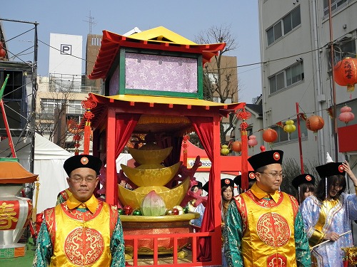 清朝時代のお正月に皇帝・皇后が揃って町中に出掛け、民衆と一緒に新しい新年を祝う様子をイメージしたパレードです。皇帝・皇后の御輿を中心に、旗隊など総勢約150名が豪華な中国衣装を身にまとってパレードします。