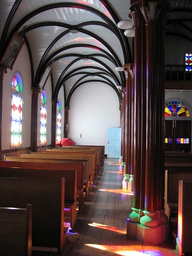 聖堂内には、ステンドグラスから優しい光が差し込み、机やいすに美しい光の影を映しています。