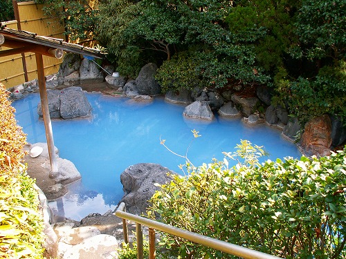 大雑把に言うと、メタ珪酸(ガラスに含まれている成分)を大量に含んでいる温泉が、湧出後に徐々に凝集し、コロイドが大きくなると空の青色を映し込み、湯が青くなっていき、時間の経過とともに段々青白く濁っていくそうです。しかし専門的なことは私にはとても難しくて説明できません。(申し訳ありません。)