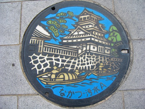 中津市のマンホールの蓋には、中津城などがデザインされています。