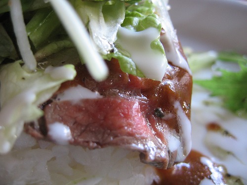 佐賀名物のシシリアンライスは、お皿に盛ったご飯の上に、ローストビーフが盛り付けられ、デミグラスソースがかかっています。その上には生野菜がトッピングされ、バジル入りの爽やかなマヨネーズソースがかかっていました。見た目も食感もおしゃれな一品でした。ドリンク付きです。