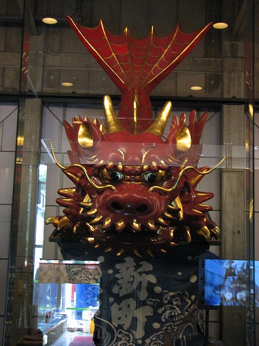 中国の伝説の四神(四霊)の鳳凰・亀・麒麟・龍の内、龍を模して作っています。龍が天に駆けあがる様、飛龍をイメージしていて、体が上下に動きます。朱塗りの体に金の角、金の牙、金の髭。以前飛龍と鯱がどっちがどっちか迷った頃がありましたが、尻尾のひれが、分れていない方が飛龍で、二つに分かれている方が鯱だと覚えました。