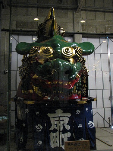 赤獅子、青獅子、金獅子と3台の獅子がいます。その中でもこの金獅子が一際大きいです。歯茎と耳の中が朱いだけで、後はほとんどきんきらきんの金獅子です。角は青獅子と同じ様に上部が二段に分かれています。ねじり鉢巻きは、赤獅子と同じで白と黒です。とにかく大きくて金ぴかぴかです。