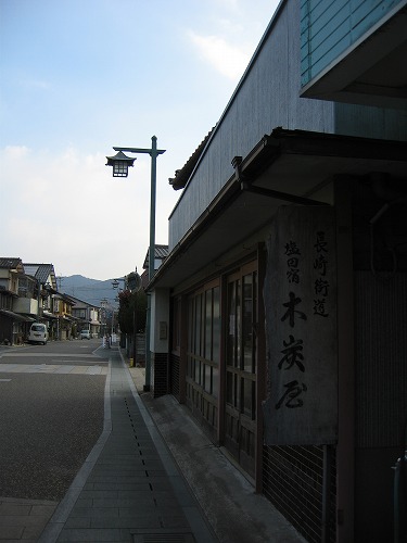 江戸時代の塩田宿は、水陸の要所であり、往来が盛んでした。江戸時代は有明海の沿岸に沿った多良街道の起点にもなっていました。塩田宿は、有明海を利用する海路と、長崎街道を通る陸路の物資の集散地として発展しました。そんな町並みにぽつりとあった「木炭屋」と書かれた木の看板。なんだか哀愁がありますね。
