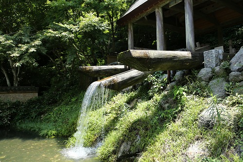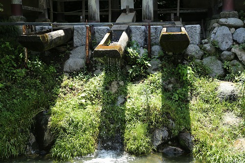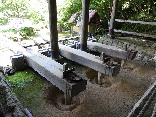陶石を細かく砕くために、水の力を利用した大型の唐臼が今も音を立てて動いています。